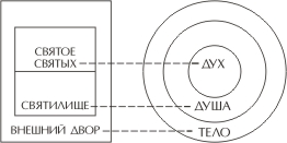 Например, в 3-й главе Первого послания к коринфянам сказано, что мы — храм Божий. Согласно Ветхому Завету, Божий храм включает в себя три части: первая — внешний двор, вторая — святилище и третья — святое святых.